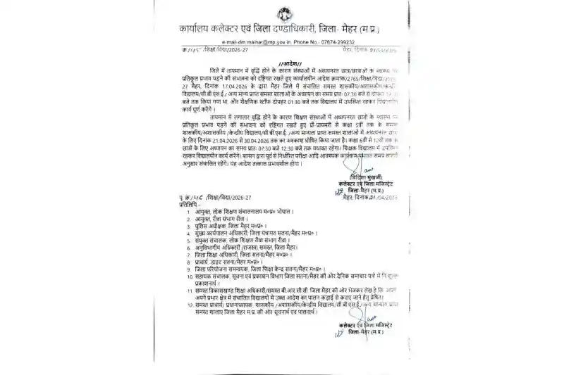 मैहर जिले में भीषण गर्मी और लू की स्थिति को देखते हुए कलेक्टर बिदिशा मुखर्जी ने कक्षा 5वीं तक के बच्चों के लिए 21 अप्रैल से 30 अप्रैल तक स्कूलों में छुट्टी के आदेश जारी किए हैं। यह आदेश जिले के सभी सरकारी, निजी, सीबीएसई और केंद्रीय विद्यालयों पर समान रूप से लागू होगा। हालांकि, कक्षा 6वीं से 12वीं तक की कक्षाएं पूरी तरह बंद नहीं की गई हैं। बड़े बच्चों के लिए स्कूल का समय सुबह 7:30 बजे से दोपहर 12:30 बजे तक निर्धारित किया गया है। शिक्षकों को दोपहर 1:30 बजे तक स्कूल में उपस्थित रहने के निर्देश दिए गए हैं, जबकि पहले से निर्धारित परीक्षाएं अपने तय समय पर ही आयोजित की जाएंगी।