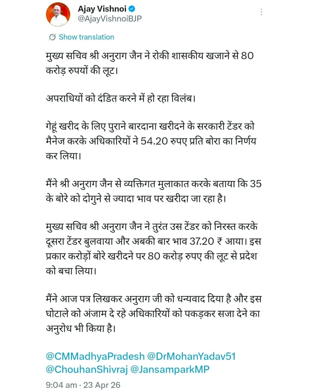 Madhya Pradesh News today : मध्य प्रदेश की राजनीति में इन दिनों बारदानों (जूट की बोरियां) की खरीदी को लेकर बड़ा विवाद खड़ा हो गया है। हाल ही में भाजपा के वरिष्ठ विधायक और पूर्व मंत्री अजय विश्नोई ने अपनी ही सरकार की टेंडर प्रक्रिया पर सवाल उठाते हुए मुख्य सचिव अनुराग जैन से शिकायत की थी।