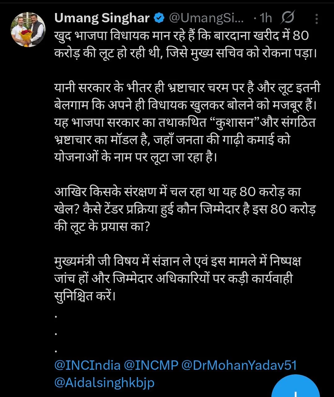 सत्ता पक्ष के विधायक के इस पोस्ट ने विपक्ष को सरकार पर हमला करने का एक बड़ा मौका दे दिया है। नेता प्रतिपक्ष उमंग सिंघार ने विश्नोई के पोस्ट का हवाला देते हुए राज्य सरकार की घेराबंदी शुरू कर दी है। सिंघार ने कहा कि मध्य प्रदेश में भ्रष्टाचार की जड़ें इतनी गहरी हो गई हैं कि अब भाजपा के अपने विधायक ही सरकार की पोल खोल रहे हैं। उन्होंने तंज कसते हुए कहा कि जब विधायक खुद मान रहे हैं कि 80 करोड़ की लूट होने वाली थी, तो यह स्पष्ट है कि विभाग में सब कुछ ठीक नहीं चल रहा है।