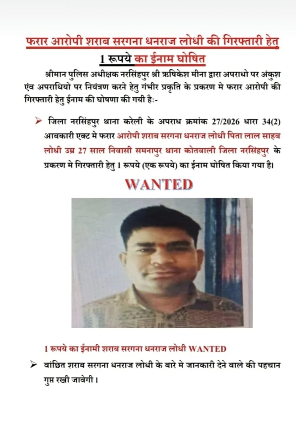 लेकिन नरसिंहपुर के पुलिस अधीक्षक डॉ. ऋषिकेश मीना ने इस बार कुछ ऐसा किया है जो न केवल अनोखा है, बल्कि अपराधियों के लिए एक बहुत बड़ा मनोवैज्ञानिक संदेश भी है। उन्होंने इलाके के कुख्यात शराब माफिया धनराज लोधी पर महज एक रुपये के इनाम की घोषणा की है। यह खबर सोशल मीडिया से लेकर चाय की दुकानों तक चर्चा का विषय बन गई है कि आखिर एक पुलिस कप्तान ने इतना मामूली इनाम क्यों रखा।